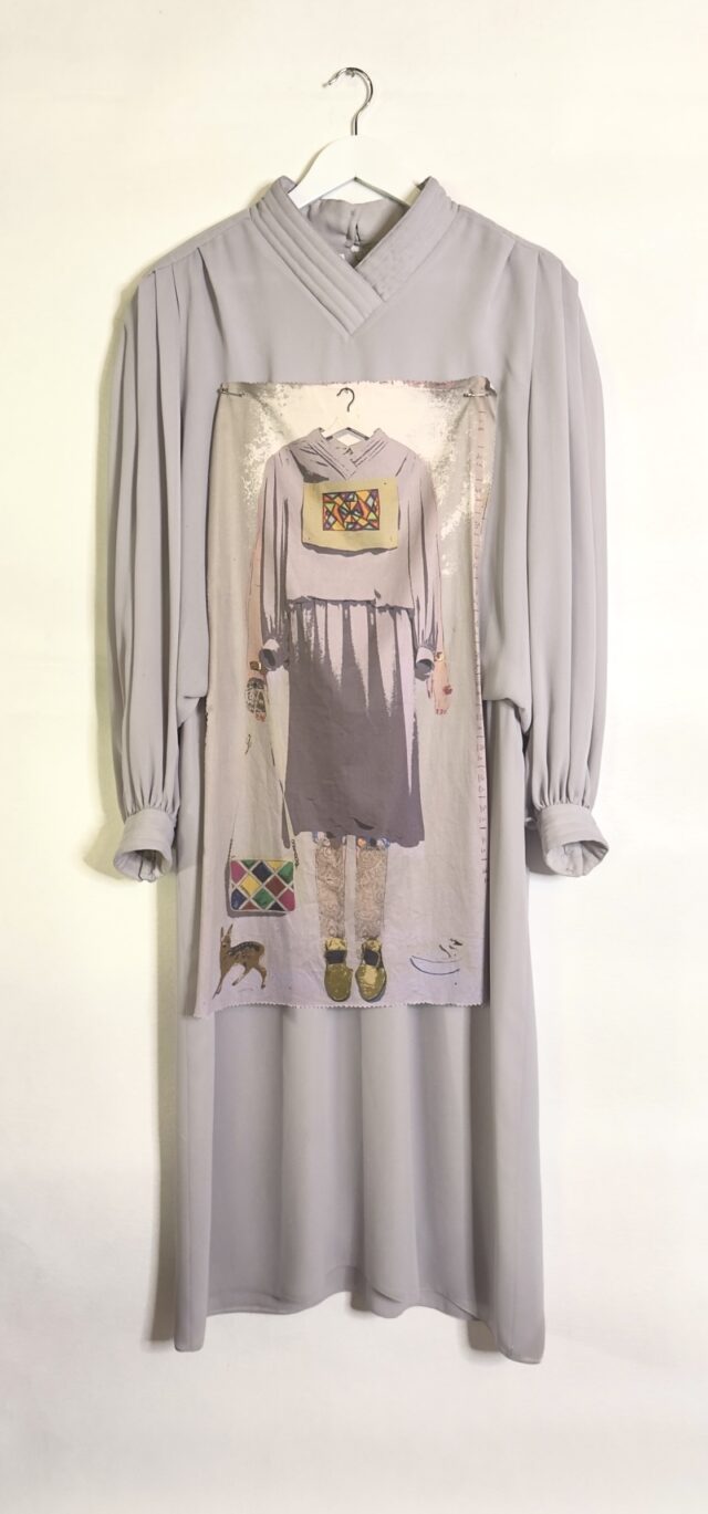 een voorkant van een jurk die je over je eigen kleding draagt. Je trekt het aan met elastiek om hoofd en middel – eenvoudig, comfortabel en direct bijzonder.